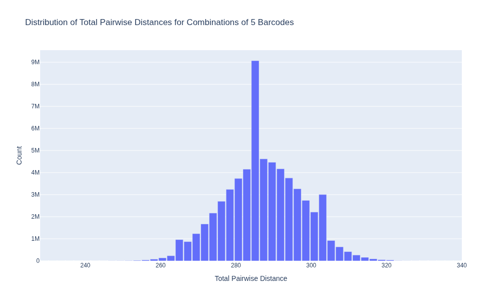 print(f"\nMean total distance between all combinations of 5 barcodes: {mean_distance:.0f}")
