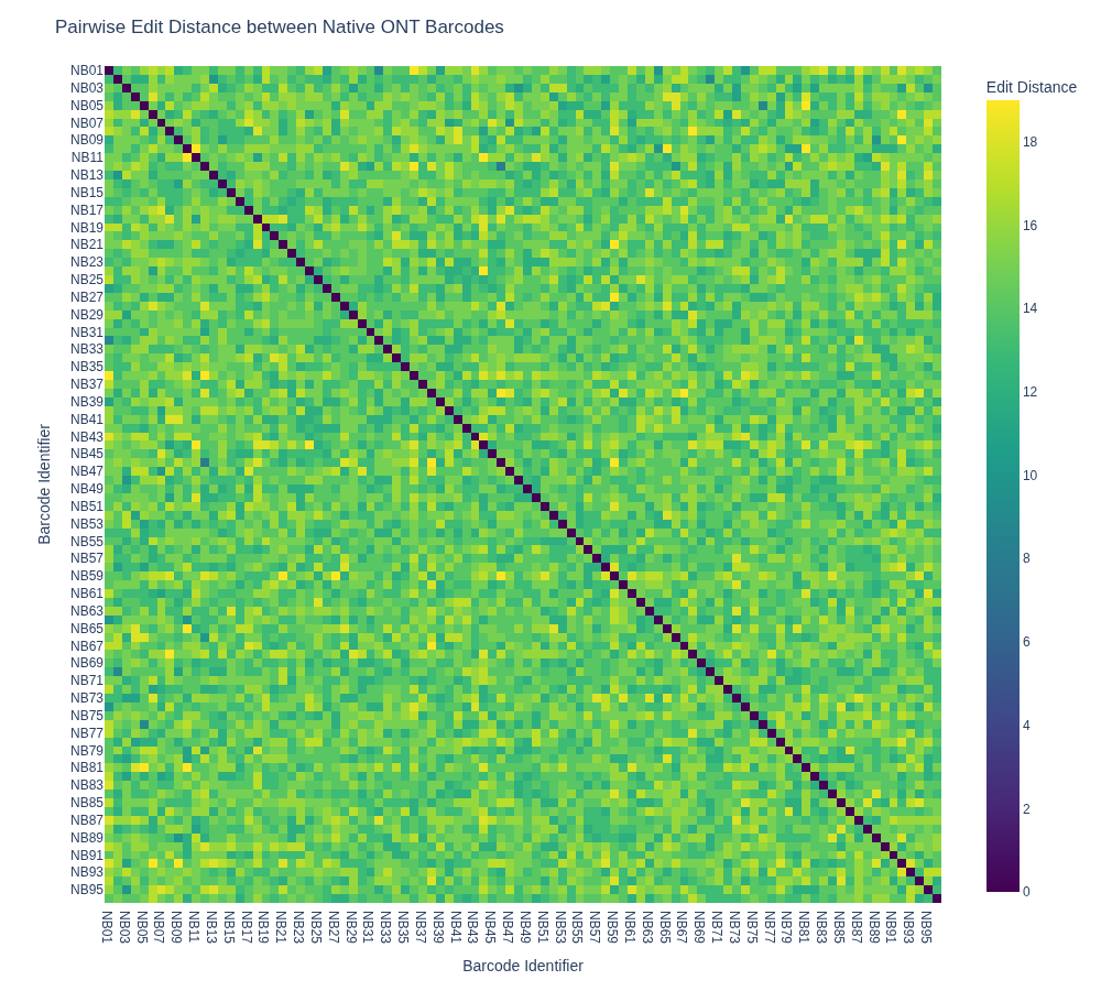 fig.update_layout(title='Pairwise Edit Distance between Native ONT Barcodes')